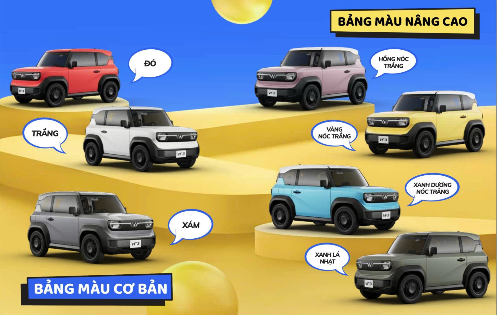 VF 3 nổi bật với bảng màu ngoại thất phong phú gồm 7 sắc thái trẻ trung, hiện đại, giúp người dùng dễ dàng lựa chọn theo gu thẩm mỹ và phong cách riêng. Dù bạn yêu thích sự tinh tế, năng động hay cá tính nổi bật, VF 3 luôn là người bạn đồng hành lý tưởng, cùng bạn hiện thực hóa những khát vọng di chuyển xanh và khác biệt.