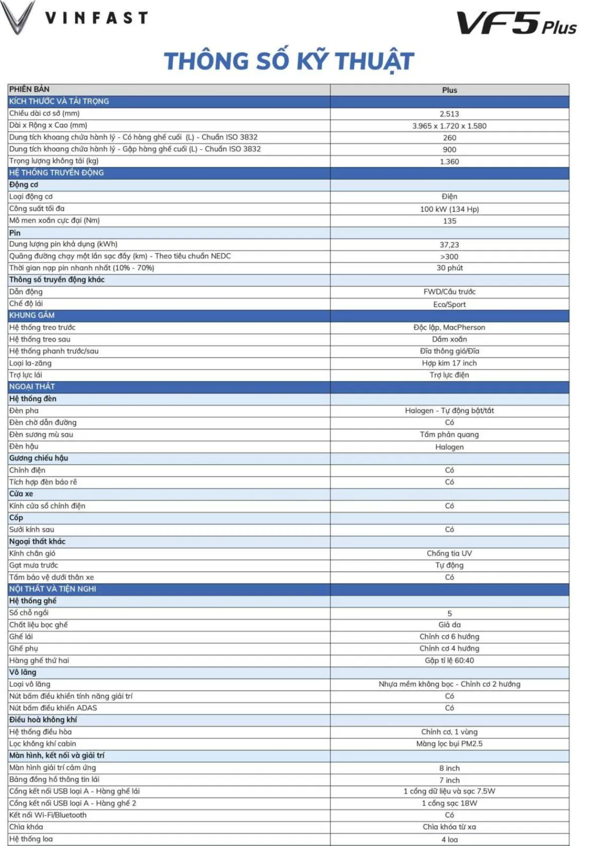 VinFast VF5  sử dụng hệ thống pin Lithium dung lượng 37,23 kWh với quãng đường cho mỗi lần sạc đầy là 300km. Tốc độ tối đa là 130 km/h. Dung lượng pin của VF5 cao hơn đàn anh VF e34 với dung lượng 42 kWh – quãng đường di chuyển tối đa cho mỗi lần sạc là 285km. Trong khi đó VF5 có thể di chuyển sau mỗi lần sạc đầy là 300km.