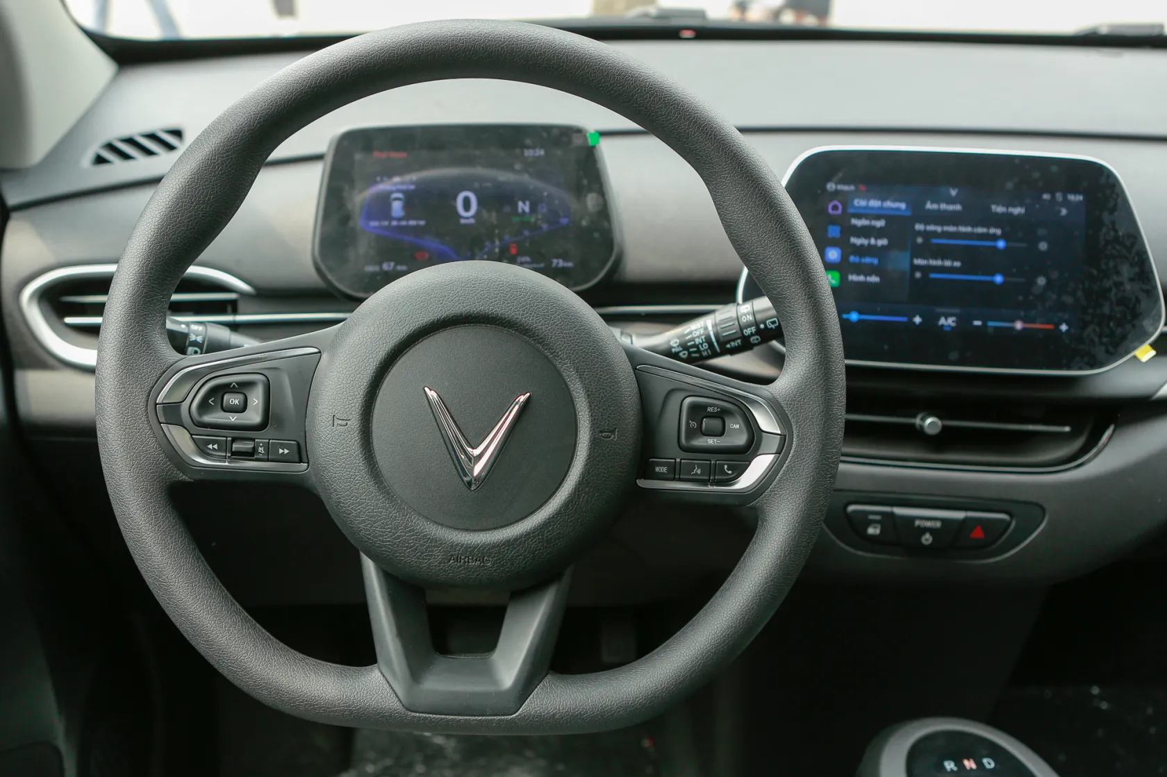 Vô-lăng xe là dạng D-cut thể thao với các điểm nhấn màu bạc, góp phần mang đến vẻ sang trọng cho mẫu SUV điện cỡ nhỏ. Bên trái vô-lăng bố trí các phím bấm media tiện dụng.