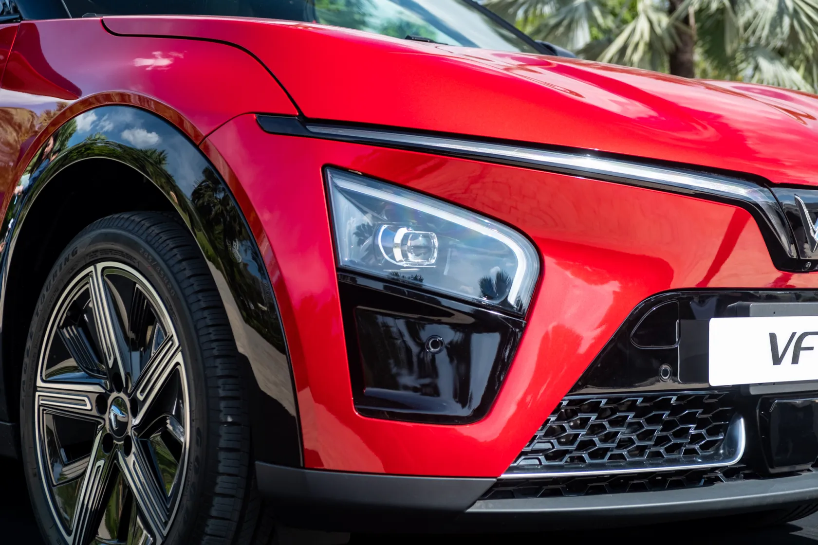 Phía dưới, bố trí cụm đèn pha LED projector kích thước lớn, nằm trọn trong khối hình thang góc cạnh. Sự xuất hiện của những đường gân dập nổi lớn trên nắp ca-pô, nhấn mạnh vẻ đẹp cơ bắp, khỏe khoắn, đậm chất SUV của VF7.