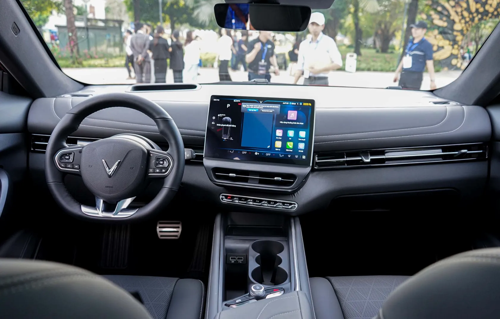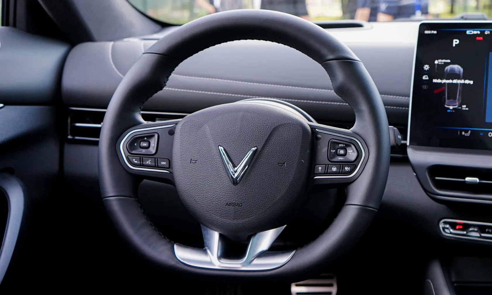 Vô-lăng xe thiết kế D-cut thể thao giống như những người anh em cùng nhà, song mang đến cái nhìn sang trọng hơn hẳn nhờ lối phối màu độc đáo. Đồng hồ hiển thị thông tin lái tiếp tục không có mặt trên mẫu SUV điện cỡ C của VinFast.