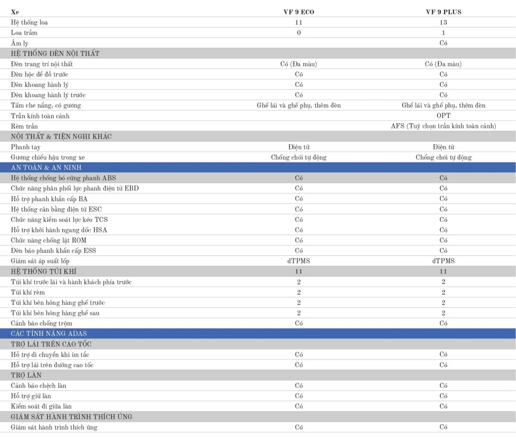 Tương tự VF8, VF9 cũng sở hữu tới 11 túi khí và hướng tới mục tiêu đạt tiêu chuẩn 5 sao ASEAN NCAP, 5 sao EURO NCAP và 5 sao NHTSA. Danh sách an toàn cụ thể của VF9 sẽ được công bố trong thời gian tới, trước mắt mẫu SUV này gây ấn tượng với nhiều công nghệ hỗ trợ lái nổi bật như: